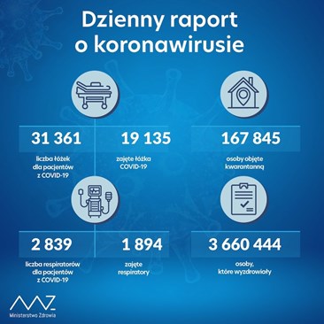 Resort zdrowia informuje też, że z powodu COVID-19 zmarło 10 osób, z powodu współistnienia COVID-19 z innymi schorzeniami zmarły 23 osoby.