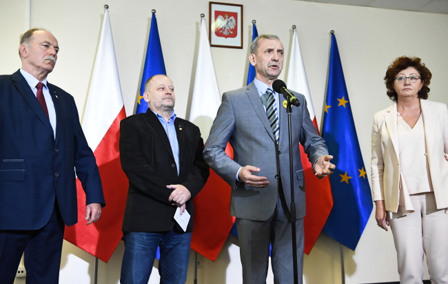 Na zdjęciu: (od prawej) przewodnicząca Forum Związków Zawodowych Dorota Gardias, prezes Związku Nauczycielstwa Polskiego Sławomir Broniarz, przewodniczący Krajowej Sekcji Oświaty i Wychowania NSZZ „Solidarność” Ryszard Proksa i przewodniczący Wolnego Związku Zawodowego "Solidarność-Oświata” FZZ Sławomir Wittkowicz.