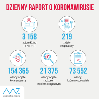 Resort zdrowia informuje też, że z powodu COVID-19 zmarły 2 osoby (wiek-płeć, miejsce zgonu): 91-M Poznań, 68-M Kościerzyna. Z powodu współistnienia COVID-19 z innymi schorzeniami zmarło 27 osób (wiek-płeć, miejsce zgonu): 51-M Ostróda, 73-M Elbląg, 81-K Warszawa, 77-K Biała Podlaska, 70-M Łęczna, 69-M, 72-M Lublin, 73-M, 74-M, 85-K, 57-K, 87-M, 85-K, 52-K, 65-M Poznań, 84-K Racibórz, 78-M, 83-K, 89-K Jarosław, 81-M, 79-K Rzeszów, 69-M, 70-K Łańcut, 67-K, 61-M, 80-M Gdańsk, 81-K Kwidzyn.