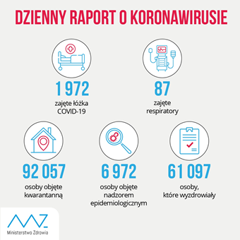 Nowe przypadki zakażenia dotyczą województw: mazowieckiego (61), małopolskiego (52), pomorskiego (46), śląskiego (45), podkarpackiego (41), opolskiego (26), łódzkiego (24), kujawsko-pomorskiego (24), wielkopolskiego (23), dolnośląskiego (9), podlaskiego (8), lubuskiego (5), świętokrzyskiego (4), lubelskiego (4), zachodniopomorskiego (3), warmińsko-mazurskiego (2).