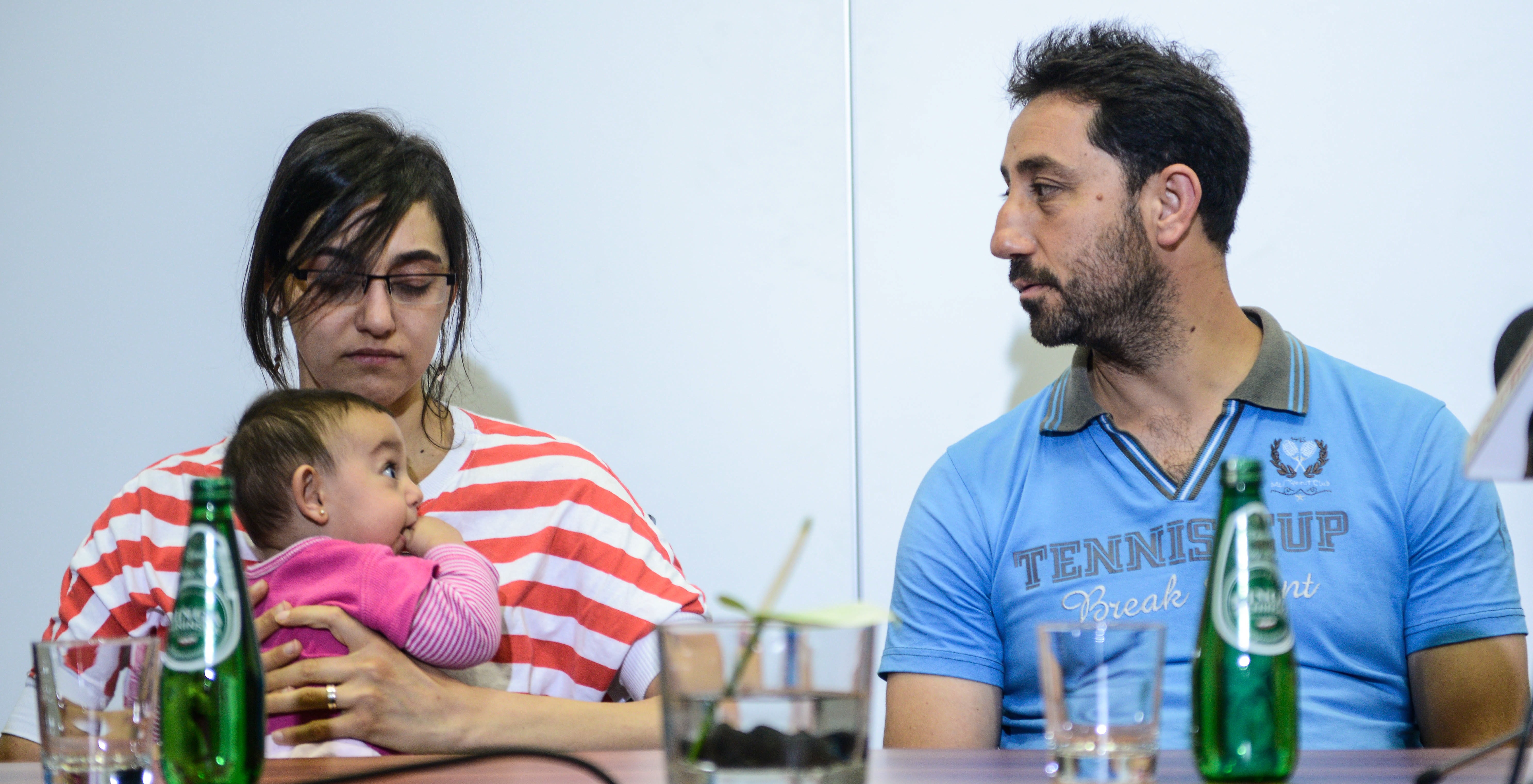 Na zdjęciu: Syryjscy uchodźcy Nahla Fadel z córką Sarą oraz Adnan Saad podczas konferencji prasowej Fundacji Estera.