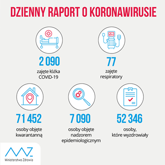 Resort zdrowia informuje też o śmierci 13 osób zakażonych koronawirusem (wiek-płeć, miejsce zgonu): 81-K Racibórz (mieszkanka woj. opolskiego), 86-K Poznań, 73-K Zgierz, 80-M Przemyśl, 56-K Mielec, 72-M Lipinki Królewskie, 80-K, 94-M, 75-M, 80-K, 75-M, 60-M, 73-M Kraków. Większość osób miała choroby współistniejące.