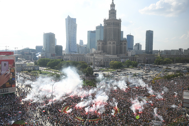 Na rondzie Dmowskiego zgromadziły się tłumy ludzi - osoby w każdym wieku oraz rodziny z dziećmi. Wielu obecnych miało biało-czerwone flagi, odpalono też biało-czerwone race. Natomiast na pl. Zamkowym zebrani utworzyli "żywy" symbol Polski Walczącej.