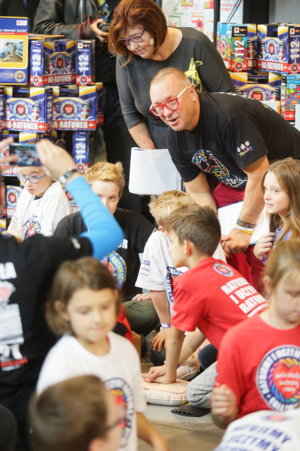 Prezes Zarządu Fundacji WOŚP Jerzy Owsiak z żoną, członkiem zarządu WOŚP Lidią Niedźwiedzką-Owsiak podczas udanej próby pobicia rekordu w jednoczesnym wykonywaniu resuscytacji krążeniowo-oddechowej przez jak największą liczbę osób. Próba bicia rekordu została zorganizowana w Centrum Nauki Kopernik, w ramach obchodów "Europejskiego Dnia Przywracania Czynności Serca". W całej Polsce przystąpiło do niej ponad 88 444 tys. zadeklarowanych osób z 1 041 instytucji.
