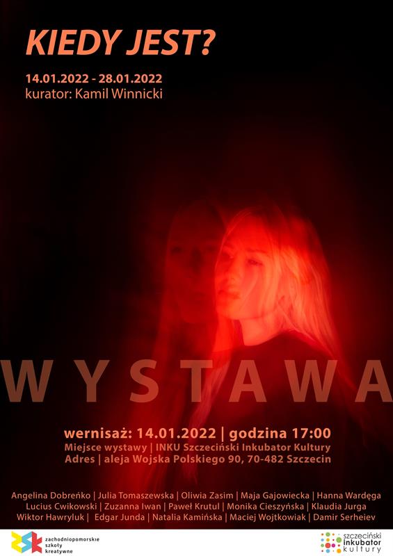 Wernisaż prac uczennic i uczniów szczecińskiego Technikum Kreatywnego (szkoły kształcącej w zawodach - technik fotografii i multimediów) odbędzie się w piątek (14 stycznia) w Inkubatorze Kultury (aleja Wojska Polskiego 90 w Szczecinie) o godz. 17. Wystawa nosi tytuł: „Kiedy jest?”, a jej kuratorem jest Kamil Winnicki.