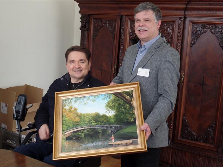Na zdjęciu: Szczeciński park Kasprowicza stał się tematem najnowszej pracy Walerego, którą podarował dyrektorowi Książnicy Pomorskiej w podziękowaniu za umożliwienie zaprezentowania artyście swojego dorobku.