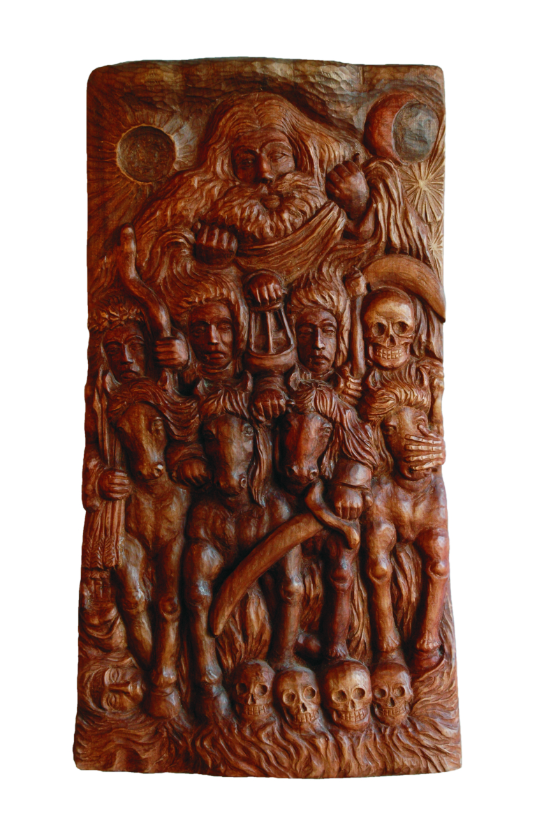 Na zdjęciu: Na wystawie zobaczymy też płaskorzeźbę z 1999 roku, przedstawiającą czterech jeźdźców Apokalipsy.