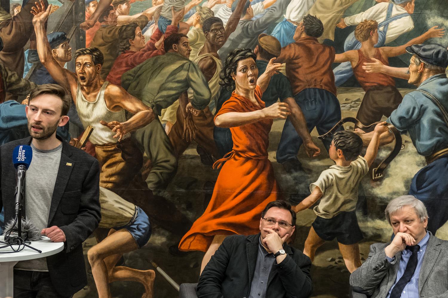 – Uwiecznieni na obrazie dokerzy, zatapiają rakiety V2, przejęte przez aliantów w czasie wojny – opowiada Szymon Piotr Kubiak, kurator wystawy. – To reakcja na to, co działo się wówczas w Korei czy Indochinach i wpisanie się w ówczesną retorykę komunistyczną. Według niej, alianci atakujący inne kraje, tworzyli nowy podobny do faszystowskiego układ. Dokerzy Singera właśnie z nim walczyli.