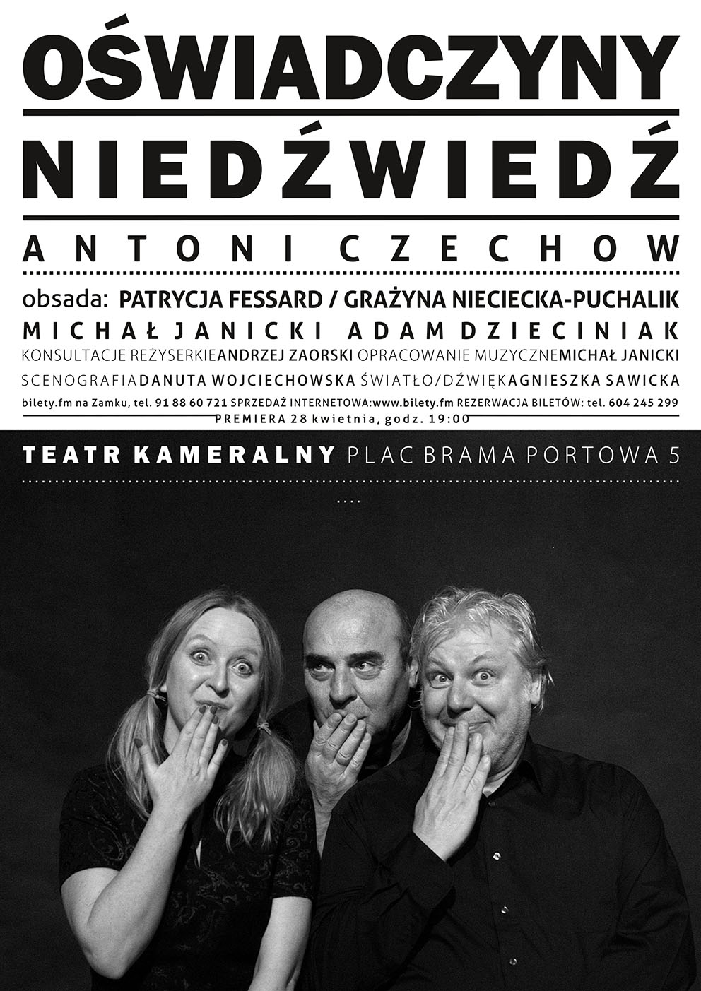 Przez śmiech, a trochę karykaturę Czechow, przypomniany na nowo w spektaklu Teatru Kameralnego, uczyć będzie o kruchości i pięknie ludzkiej psychiki wystawianej codziennie na próbę emocji. Bez wątpienia warto ten spektakl zobaczyć. Na scenie teatru wystąpią: Patrycja Fessard, Michał Janicki i Adam Dzieciniak.