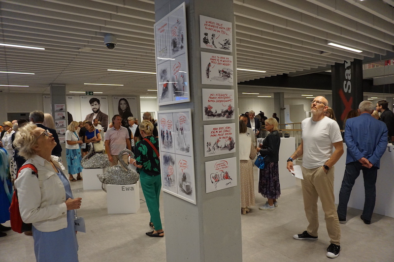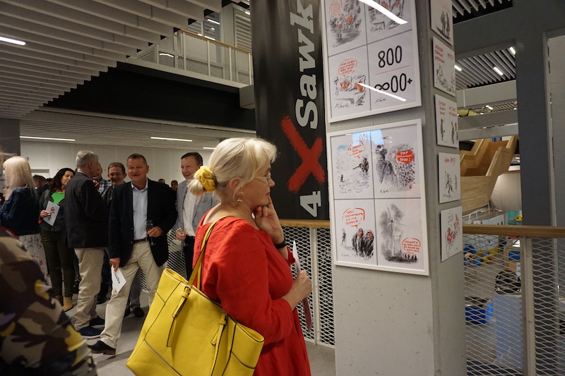 Na wystawie pokazano sto rysunków Henryka Sawki ukazujących naszą rzeczywistość w krzywym zwierciadle – ich cechą szczególną są „dymki” celnie puentujące przedstawianą scenkę. Kolejną część ekspozycji stanowią prace Ewy, Karoliny i Kuby Sawka.
