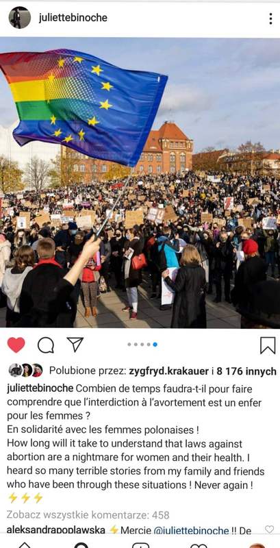 Francuska aktorka, zdobywczyni Oscara, znana z takich filmów, jak "Trzy kolory. Niebieski", "Angielski pacjent" czy "Czekolada", umieściła również na Instagramie kilka zdjęć z protestów z ostatnich dni. Wśród nich jest fotografia z placu Solidarności w Szczecinie.
