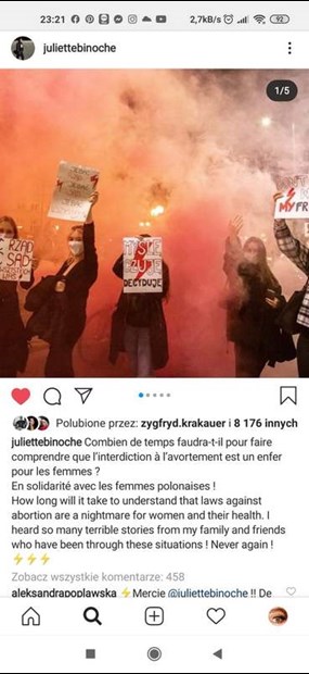 Gwiazda kina, Juliette Binoche, na Instagramie poparła protesty na polskich ulicach i wyraziła swoją solidarność z kobietami, które nie zgadzają się z orzeczeniem Trybunału Konstytucyjnego co do zaostrzenia prawa aborcyjnego. Napisała również, że zakaz aborcji jest piekłem dla kobiet. Czytamy tu m.in.: "Ile czasu musi minąć, żebyście zrozumieli, że prawa przeciwko aborcji są koszmarem dla kobiet i ich zdrowia? Słyszałam mnóstwo strasznych historii od mojej rodziny i przyjaciółek, które przeszły przez takie sytuacje. Nigdy więcej!".