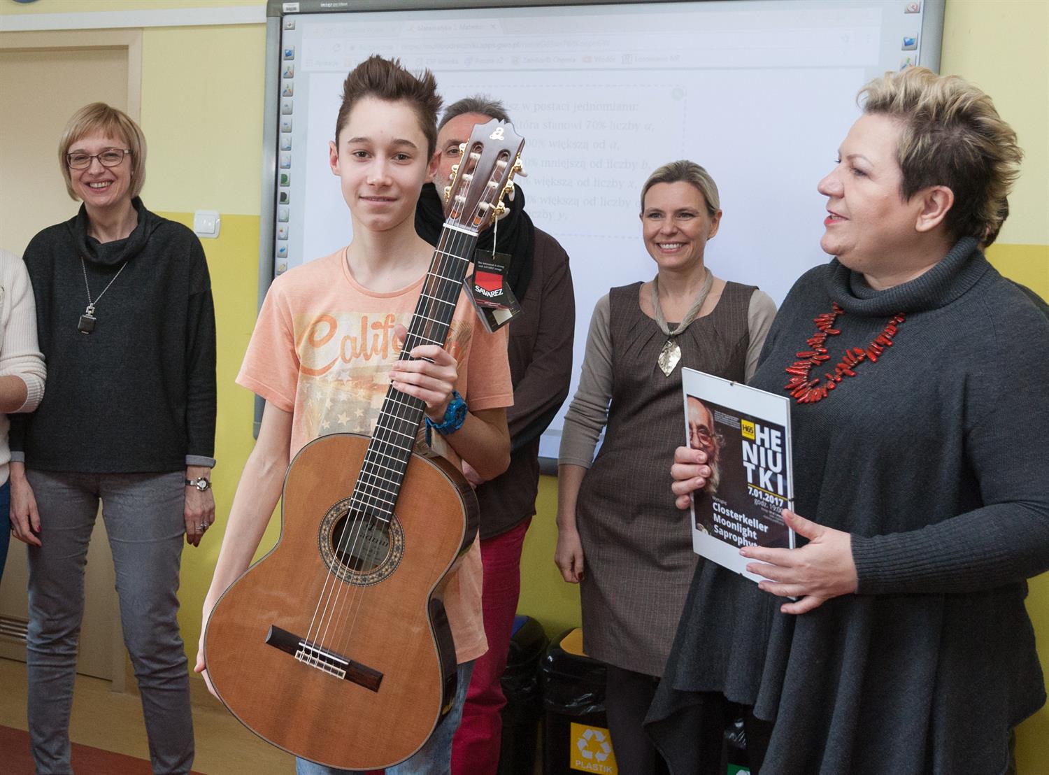 Gitarę otrzymał w czwartek (26 stycznia) uczeń Zespołu Szkół Publicznych w Kliniskach Wielkich, dwunastoletni Jakub Kupski. Chłopiec dostał instrument dzięki hojności publiczności niedawnego koncertu „Heniutki 65” w szczecińskim Słowianinie. Ideą imprez w rocznice kolejnych urodzin Henia Talaśki, zmarłego kilka lat temu przyjaciela artystów, jest bowiem m.in. zbiórka pieniędzy na instrumenty muzyczne dla wybitnie uzdolnionych dzieci. W tym roku pieniędzy starczyło na zakup gitary dla ucznia z Klinisk oraz altówki dla Karoliny z Benic koło Golczewa. Kuba był bardzo zaskoczony prezentem wręczonym mu na matematyce. Najpierw jednak na lekcję weszła dyrektorka placówki, wraz z Ingą Kurek-Baranowską ze „Słowianina" i gitarzystą Waldemarem Baranowskim, ogłaszając „niezapowiedzianą wizytację z województwa". Potem był wspomniany moment niespodzianki, czyli przekazania gitary Kubie. Zorganizowano też w klasie minikoncert zdolnego ucznia, który zagrał wszystkim kolędę. ©℗