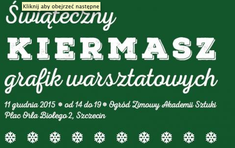 Koło Naukowe „Fraktal" wraz z Akademią Sztuki w Szczecinie zapraszają wszystkich poszukujących świątecznej atmosfery na kiermasz, który odbędzie się 11 grudnia (piątek) w Ogrodzie Zimowym Akademii Sztuki przy pl. Orła Białego 2. Od godziny 14 do 19 będzie można obejrzeć grafiki studentów oraz wykonane specjalnie na tę okazję kartki, będące oryginalną alternatywą dla zwyczajnych kartek świątecznych. Podczas wydarzenia będzie można nabyć stroiki, ozdoby i wiele innych rzeczy. Kiermasz, poza stworzeniem świątecznego nastroju, ma na celu także pokazanie mieszkańcom grafiki warsztatowej tworzonej przez studentów i pracowników uczelni. Dochód z kiermaszu wesprze działalność Koła naukowego Fraktal.