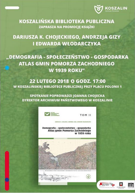 Dziś (22 lutego) o g. 17 Koszalińska Biblioteka Publiczna zaprasza na promocję publikacji pt. „Demografia – społeczeństwo – gospodarka. Atlas gmin Pomorza Zachodniego w 1939 roku”.