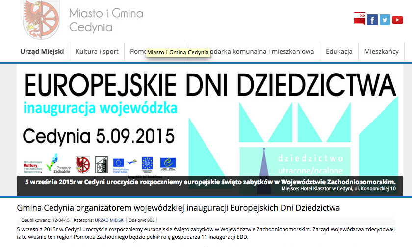 W sobotę, w tym roku w Cedyni, zaczynają się oficjalnie tegoroczne Europejskie Dni Dziedzictwa w województwie zachodniopomorskim. Organizowane są jak zawsze pod patronatem Rady Europy, a ich tegoroczne hasło w Polsce brzmi: „Dziedzictwo utracone. Dziedzictwo ocalone”.