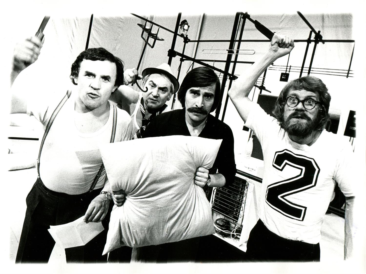 Fot. 2: Tadeusz Zapaśnik, Jerzy Ernz, Jacek Polaczek i Mirosław Gruszczyński w spektaklu „Ludzie energiczni" z 1977 roku