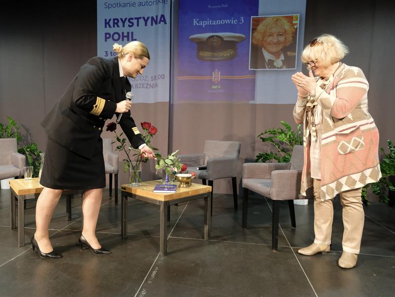 – Na okładce są dwie firmy: Polska Żegluga Morska, dzięki wsparciu finansowemu której książka się ukazała, i wydawnictwo Zapol, które pięknie ją wydrukowało – mówiła Krystyna Pohl podczas spotkania w Starej Rzeźni. – To jest moja piąta książka, którą odebrałam z Zapolu. W tej książce przedstawiłam sylwetki 92 kapitanów, którzy pracowali, pracują u różnych armatorów, pływają na bardzo różnych statkach i ciekawiło mnie to, w jaki sposób doszli do mostku kapitańskiego, co ich skłoniło, żeby wybrać ten zawód. Ciekawiły mnie ich przygody, wspomnienia, refleksje.