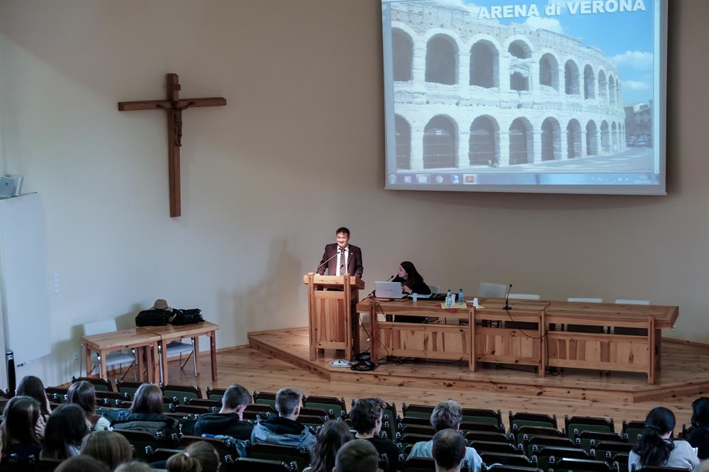 Tegoroczny Tydzień Języka Włoskiego na Świecie odbywa się pod hasłem „Język włoski w muzyce, muzyka w języku włoskim". Nawet wykład arch. Rudiego Fontany podporządkowany był muzyce. Prelegent najpierw omówił zjawisko dźwięku i wytłumaczył proces rozróżniania hałasu od melodii. Potem zaś scharakteryzował słynne włoskie budowle, w których można posłuchać muzyki (od rzymskiej areny w Weronie, przez teatr La Fenice w Wenecji, po stadiony sportowe, na których organizowane są koncerty często dla wielu tysięcy słuchaczy.