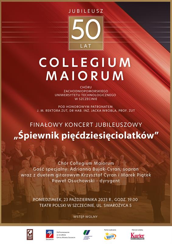 Chór Collegium Maiorum Zachodniopomorskiego Uniwersytetu Technologicznego w Szczecinie świętuje w tym roku swój złoty jubileusz. Z tej okazji chór zaprasza w poniedziałek 23 października na Finałowy Koncert Jubileuszowy pt. „Śpiewnik pięćdziesięciolatków”. Odbędzie się on w sali szekspirowskiej Teatru Polskiego w Szczecinie. Początek o godz. 19.