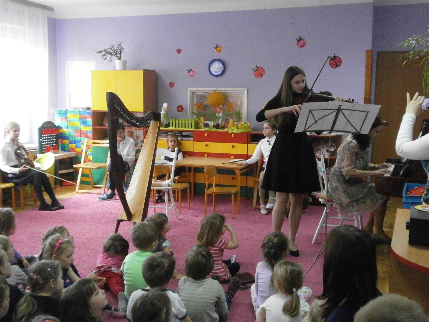 Wyjątkowi goście odwiedzili niedawno dzieci ze szczecińskiego Przedszkola Publicznego nr 20. Otóż w ramach współpracy z Państwową Szkołą Muzyczną I stopnia w placówce przedszkolnej odbył się koncert uczniów pt. „Na dwa, na trzy, na cztery”. Przedszkolaki poznały zatem wygląd i nazwy instrumentów muzycznych, ale przede wszystkim mogły posłuchać ich zróżnicowanych dźwięków. Na przedszkolnej scenie zabrzmiał m.in. główny motyw z filmu „Titanic” (zagrany na trąbce), „Wiosenny walc” (na fortepianie) czy „Małe bolero” (na harfie). Przedszkolaki nauczyły się również taktowania, zaznaczając grany rytm ruchem rąk. Jak oceniły dzieci i nauczycielki, młodzi, utalentowani muzycy zagrali wspaniałe melodie, wprawiając widownię w zachwyt i w radosny, wiosenny nastrój.