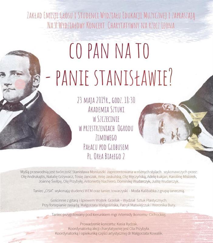 Koncert, który odbędzie się w siedzibie akademii, czyli w Pałacu pod Globusem przy placu Orła Białego 2, będzie się opierał na twórczości Stanisława Moniuszki w różnorodnych wykonawczych wersjach stylistycznych. Poprowadzi go Katarzyna Rydzak. Organizowany jest przez Zakład Emisji Głosu Wydziału Edukacji Muzycznej AS pod opieką dr Małgorzaty Kowalik. Koordynatorką charytatywnej akcji dla Leonka wymagającego codziennej rehabilitacji, a nad którym opiekę sprawuje tylko mama, jest studentka wokalistyki i dyrygentury chóralnej Aleksandra Przybyła.