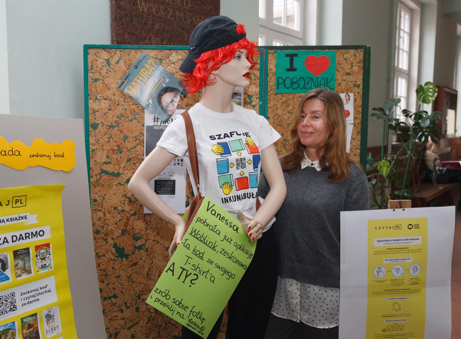 Na zdjęciu: Manekin Vanessa z DK 13 Muz zachęca w II LO do "polowania" na książki, z prawej: koordynatorka akcji Ewa Smólska.