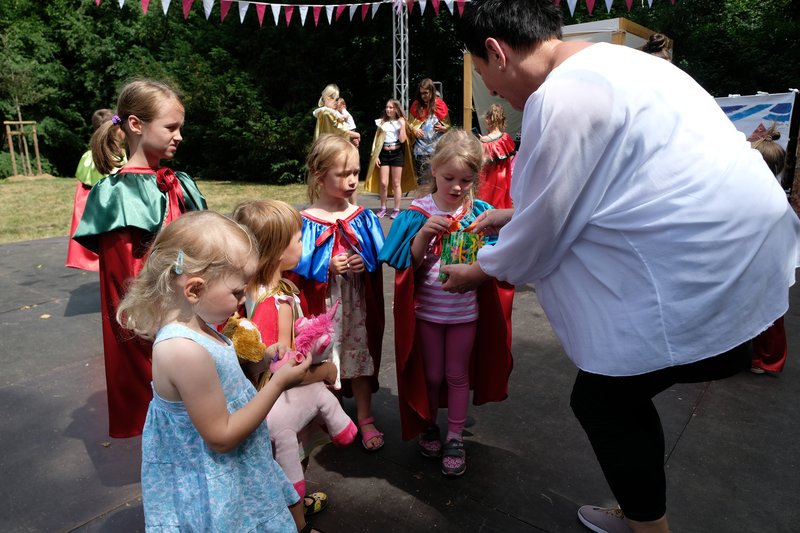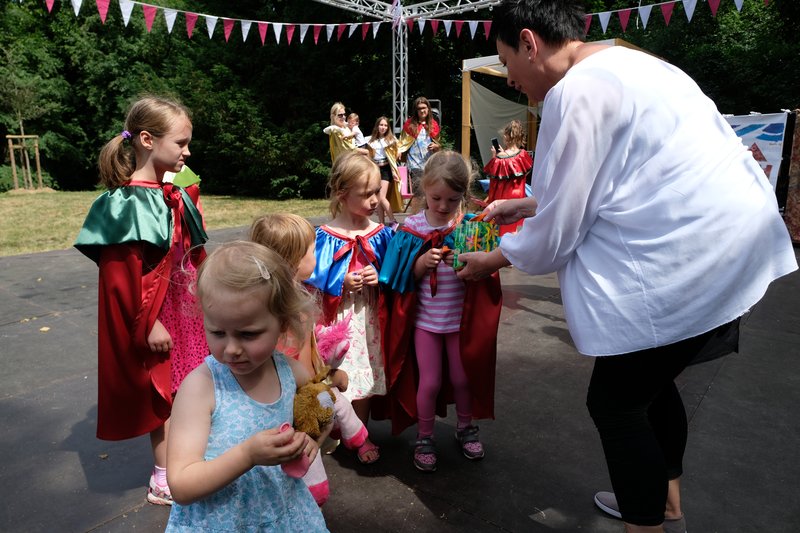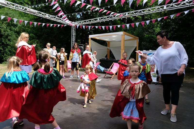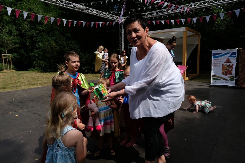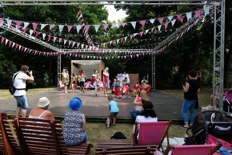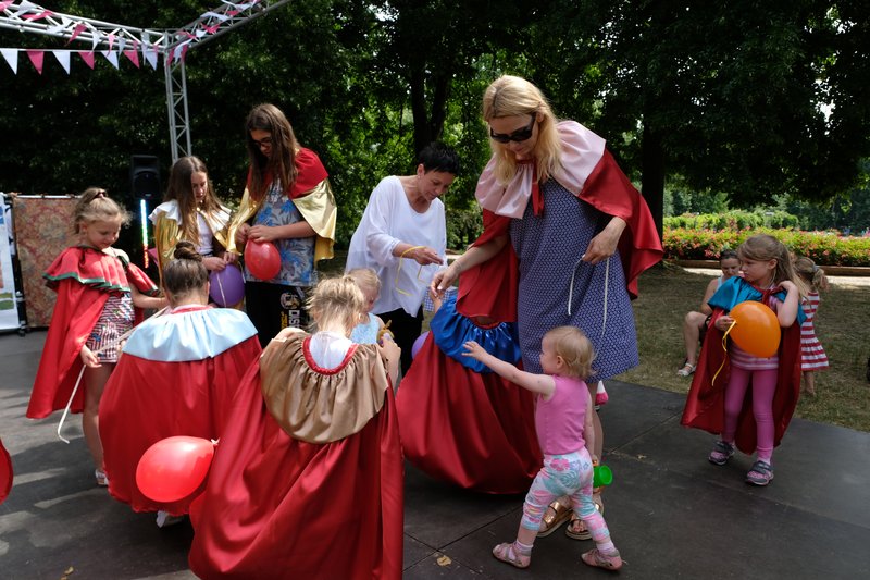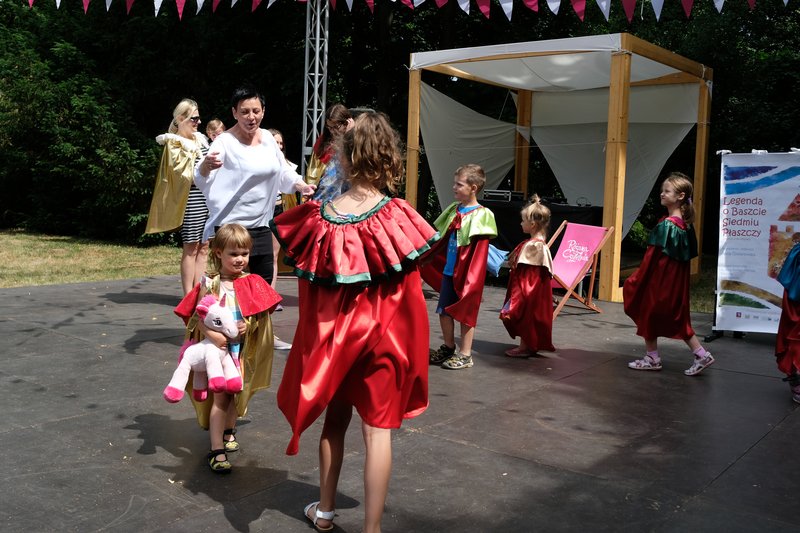 Również w sobotę w ramach programu „Różanka Dzieciom" w ogrodzie zorganizowano zajęcia teatralne pt. „Ciało w teatrze", których głównym tematem była pantomima. Najmłodszym zaproponowano natomiast warsztaty plastyczne, podczas których powstawały rekwizyty wykorzystane w scenach spektaklu teatralnego „Legenda o Baszcie Siedmiu Płaszczy". Dzieci wykonywały też stempelki oraz przenosiły wzór na karton lub tkaninę w ramach zajęć plastycznych - „Ślady, wzory i odbicia”.