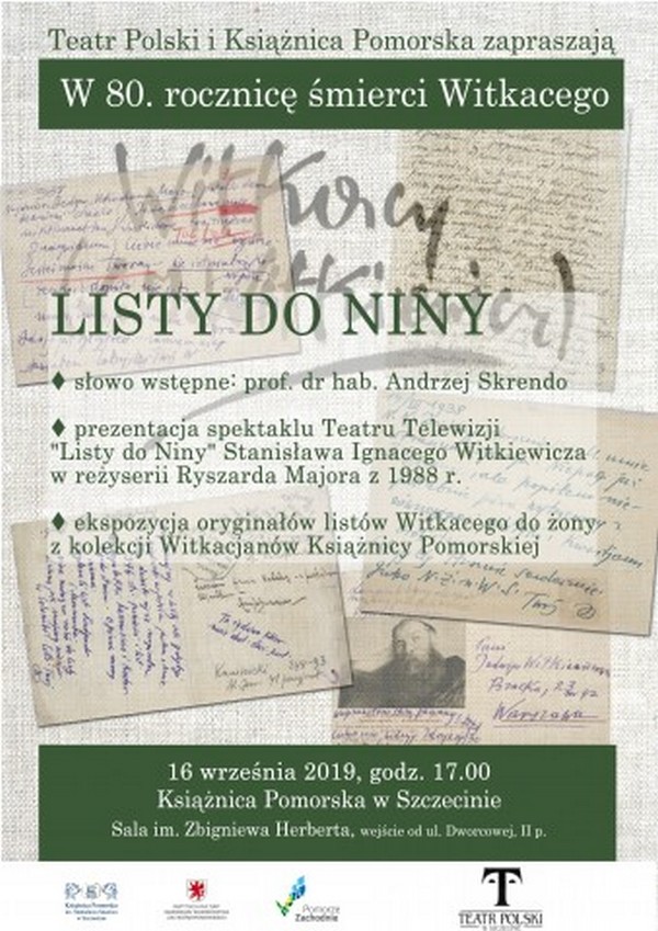 W poniedziałek (16 września) w Książnicy Pomorskiej w Szczecinie (sala im. Z. Herberta) zaprezentowane zostaną listy Stanisława Ignacego Witkiewicza do żony. Teatralną ich prezentację stanowić będzie projekcja archiwalnego spektaklu TVP „Listy do Niny”. Początek spotkania g. 17.