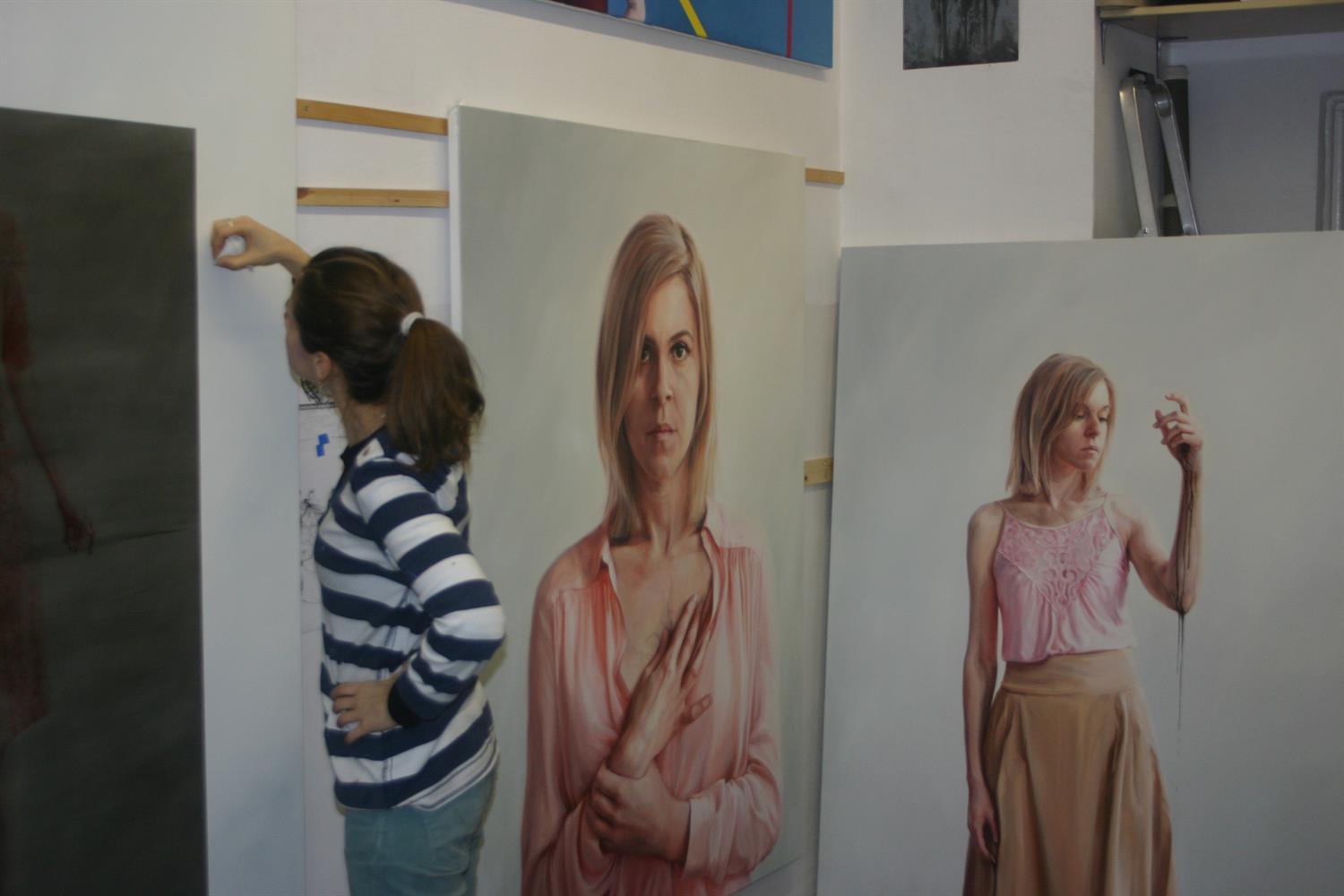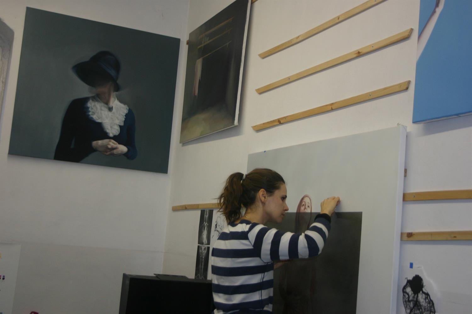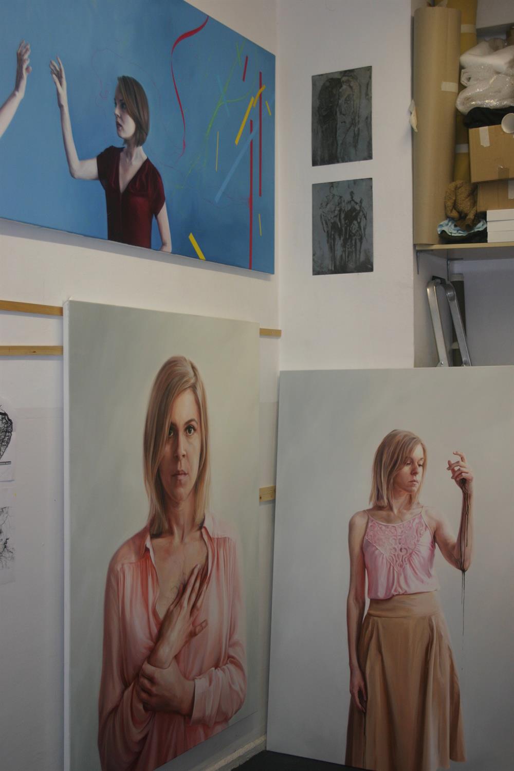 Aż trudno uwierzyć, że malarka, która tworzy obrazy na dużych formatach, zajmuje tak małe pomieszczenie. Bym mógł wejść do środka, artystka musi wycofać się w głąb pokoiku. Przeciskam się więc między framugą a obrazami i oto nagle staję na środku tej mikropracowni. Ze ścian i sztalug spoglądają na mnie hipnotycznym wzrokiem zanurzone w swojej tajemniczej psychice bohaterki Agaty Wolniewicz.