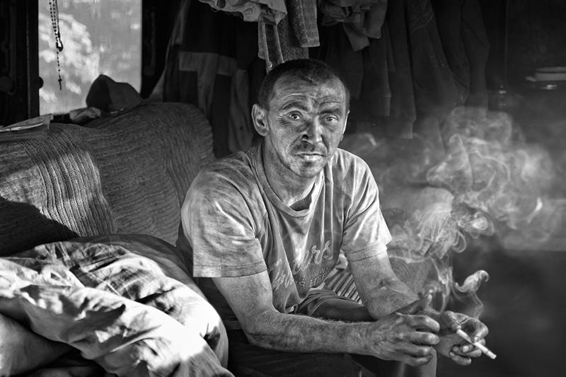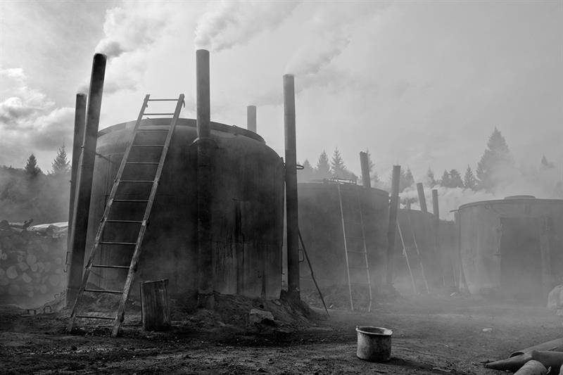 Wystawa „Między dymem a… rzeczywistością” to dokument artystyczny realizowany w latach 2013-2015 w Bieszczadach, na jednym z ostatnich i prawdopodobnie największym wypale węgla drzewnego w Polsce. Pokazuje smolarzy – mikrospołeczność rzadko dopuszczającą do siebie obcych.