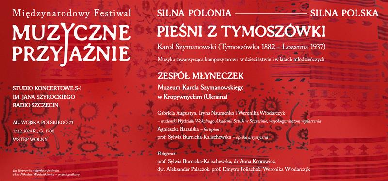 W Szczecinie rozbrzmiewać będą pieśni z okolic Tymoszówki (Ukraina) – miejsca urodzenia Karola Szymanowskiego. Echa słuchanych przez twórcę melodii, znaleźć można w dziełach artysty. Większość z nich wykona zespół polonijny МЛИНОЧОК z Ukrainy, a także Gabriela Augustyn, Iryna Naumenko i Weronika Włodarczyk – studentki Wydziału Wokalnego Akademii Sztuki w Szczecinie oraz pianistka Agnieszka Barańska. Opiekę artystyczną nad występem objęła prof. Sylwia Burnicka-Kalischewska.