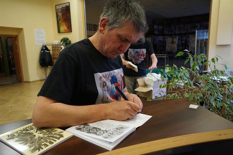 – Ilustracje wykonuję mieszanymi technikami z wykorzystaniem takich barwników naturalnych jak kawa czy herbata – Powiedział Marcin „Yperyt” Przydatek. – Przypomnę, że najwcześniejsze pigmenty wykonywano z kolorowych wytworów natury takich jak kreda, ochra, sadza i węgiel drzewny.