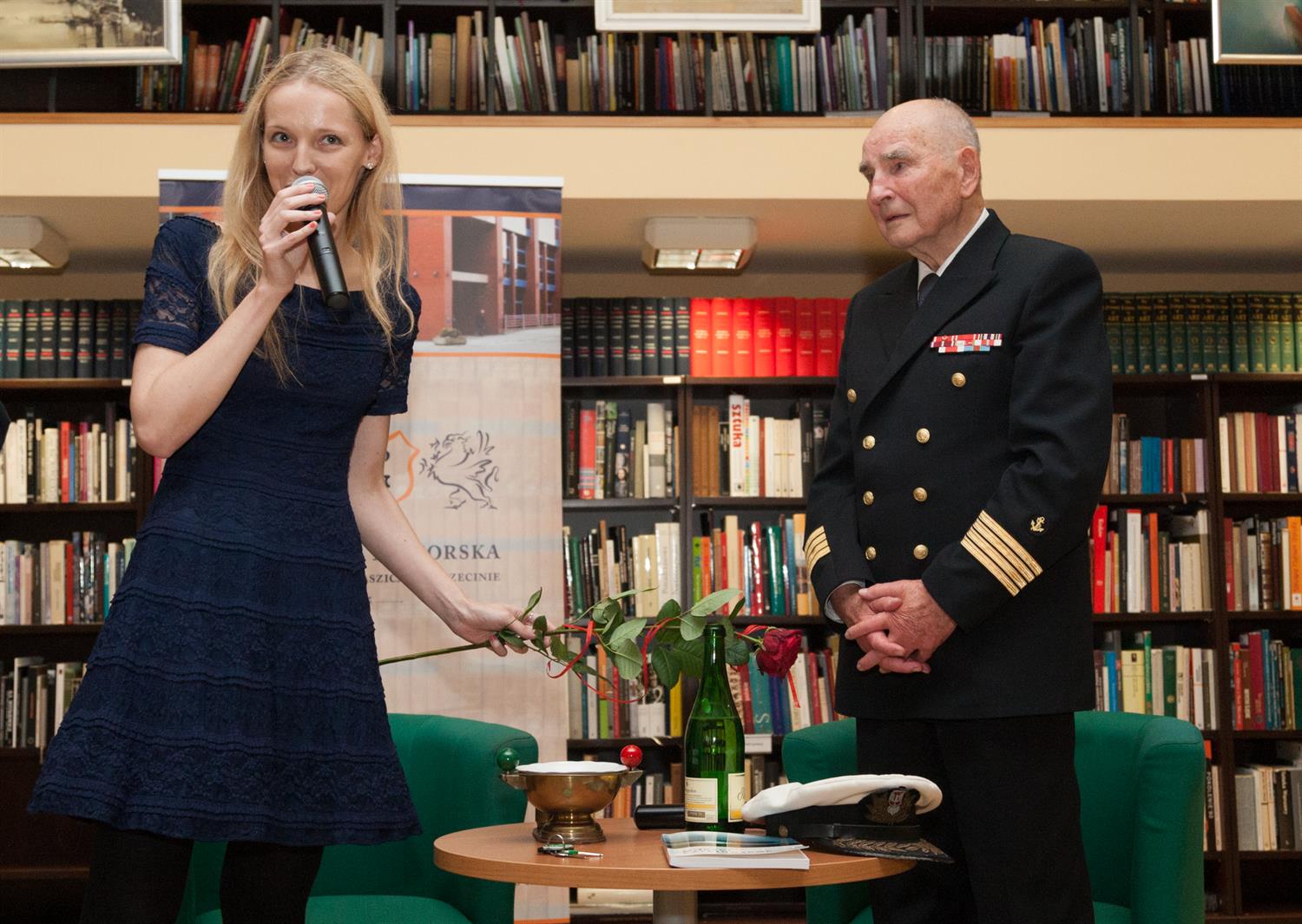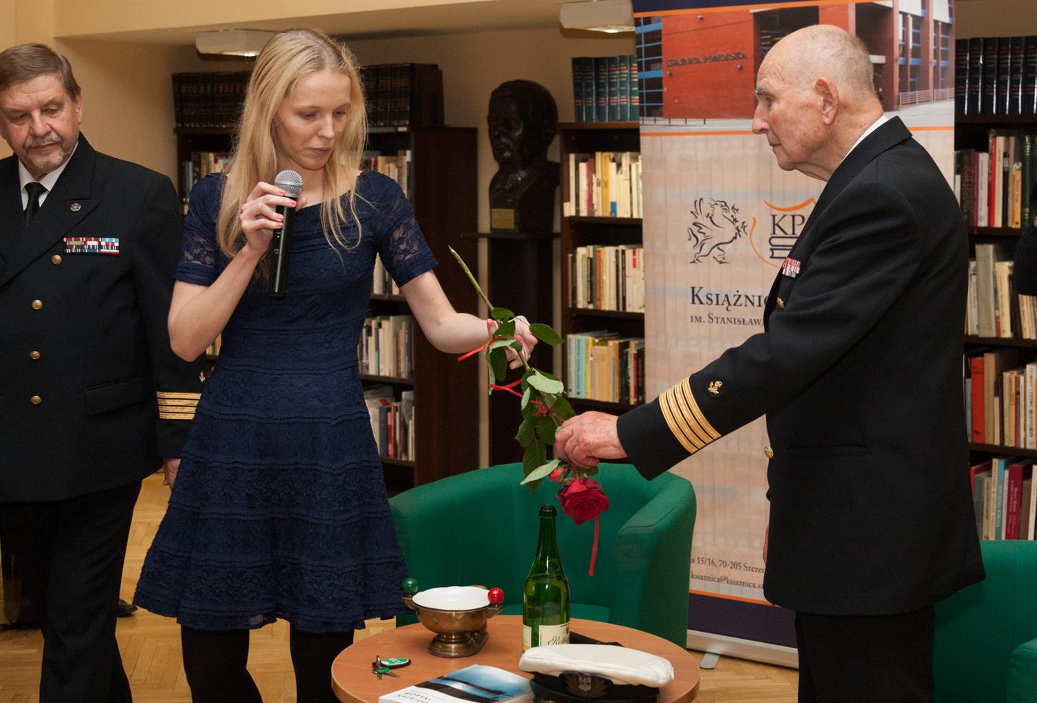 – Miałam przyjemność pracować z panem Eugeniuszem i robić drobne korekty – mówiła Karolina Boniecka, która została matką chrzestną „Morskiego kalejdoskopu” i zwodowała książkę, skrapiając ją – za pomocą róży – szampanem.