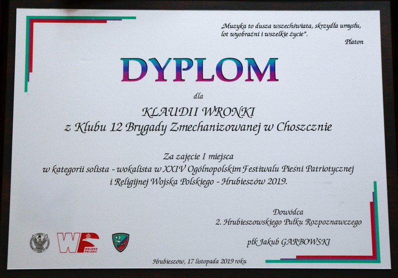 Muzyka jest jej pasją od ponad 15 lat, a 17 listopada została doceniona na XXIV Festiwalu Pieśni Patriotycznej i Religijnej Wojska Polskiego. Mowa o szeregowym Klaudii Wronce z 12 Brygady Zmechanizowanej, która zajęła I miejsce wśród 180 uczestników Festiwalu.