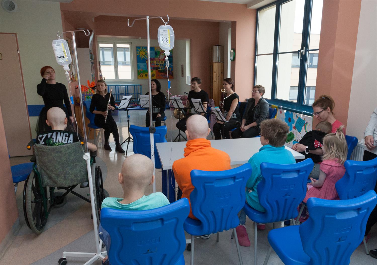 Dzieci usłyszały zatem na żywo koncert kwintetu dętego drewnianego (w składzie: flet, obój, klarnet, waltornia i fagot) oraz poznały się z Brombą, bohaterką spektaklu opartego na opowiadaniach Marcina Wojtyszki. Było to kolejne spotkanie w ramach cyklu: „DoNuta taktuje – W trasie”, który zakłada wyjazdowe koncerty dla najmłodszych. Jak mówi Jakub Gibowski - rzecznik filharmonii, tym razem pracownicy tej instytucji zorganizowali wewnętrzną zbiórkę pieniędzy i opłacili dzieciom udział w wydarzeniu. Na zdjęciu - ekipa filharmonii w Klinice Pediatrii, Hematologii i Onkologii Dziecięcej przy Unii Lubelskiej, w budynku św. Mikołaja.