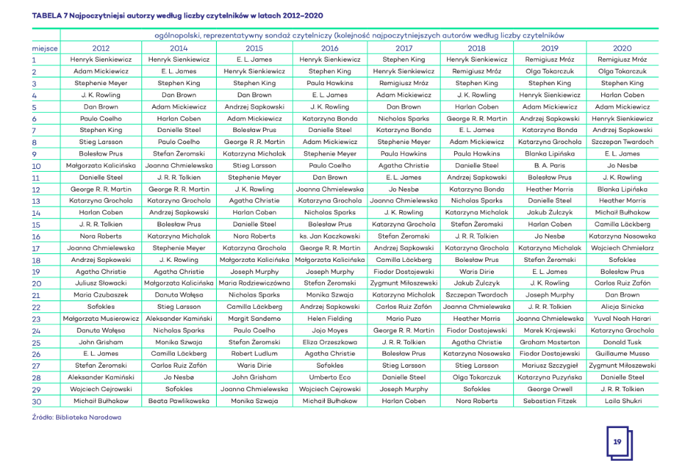 W drugiej piątce jest trzech polskich autorów, kolejno - Henryk Sienkiewicz, Andrzej Sapkowski i Szczepan Twardoch, a następnie autorka powieści erotycznej - "Pięćdziesiąt twarzy Greya" (czyli E. L. James) oraz norweski twórca kryminałów - Jo Nesbø. A propos dwóch ostatnich nazwisk - w zestawieniu najchętniej czytanych autorów książek na kolejnych miejscach są również ci, którzy piszą powieści erotyczne, jak Blanka Lipińska (wysokie, bo 12. miejsce) i kryminały - ot, choćby po raz pierwszy Wojciech Chmielarz, ale też Zygmunt Miłoszewski i Camilla Läckberg. Z kolei na liście trzydziestu najpoczytniejszych autorów w ub. roku po raz pierwszy od 2012 w rankingu nie znalazła się Joanna Chmielewska, autorka powieści sensacyjnych, kryminalnych, komedii obyczajowych, a także książek dla dzieci i młodzieży. Nie ma tu też Katarzyny Bondy, która w pojawiała się w zestawieniu ostatnich lat, a w 2019 roku była nawet na siódmym miejscu. Ani dwóch innych polskich "kryminalistów" - Marka Krajewskiego i Katarzyny Puzyńskiej. Z zestawienia za 2020 rok wypadł Jakub Żulczyk, choć był obecny na listach za 2018 i 2019, również za sprawą sukcesu serialu na podstawie jego książki - "Ślepnąc od świateł".