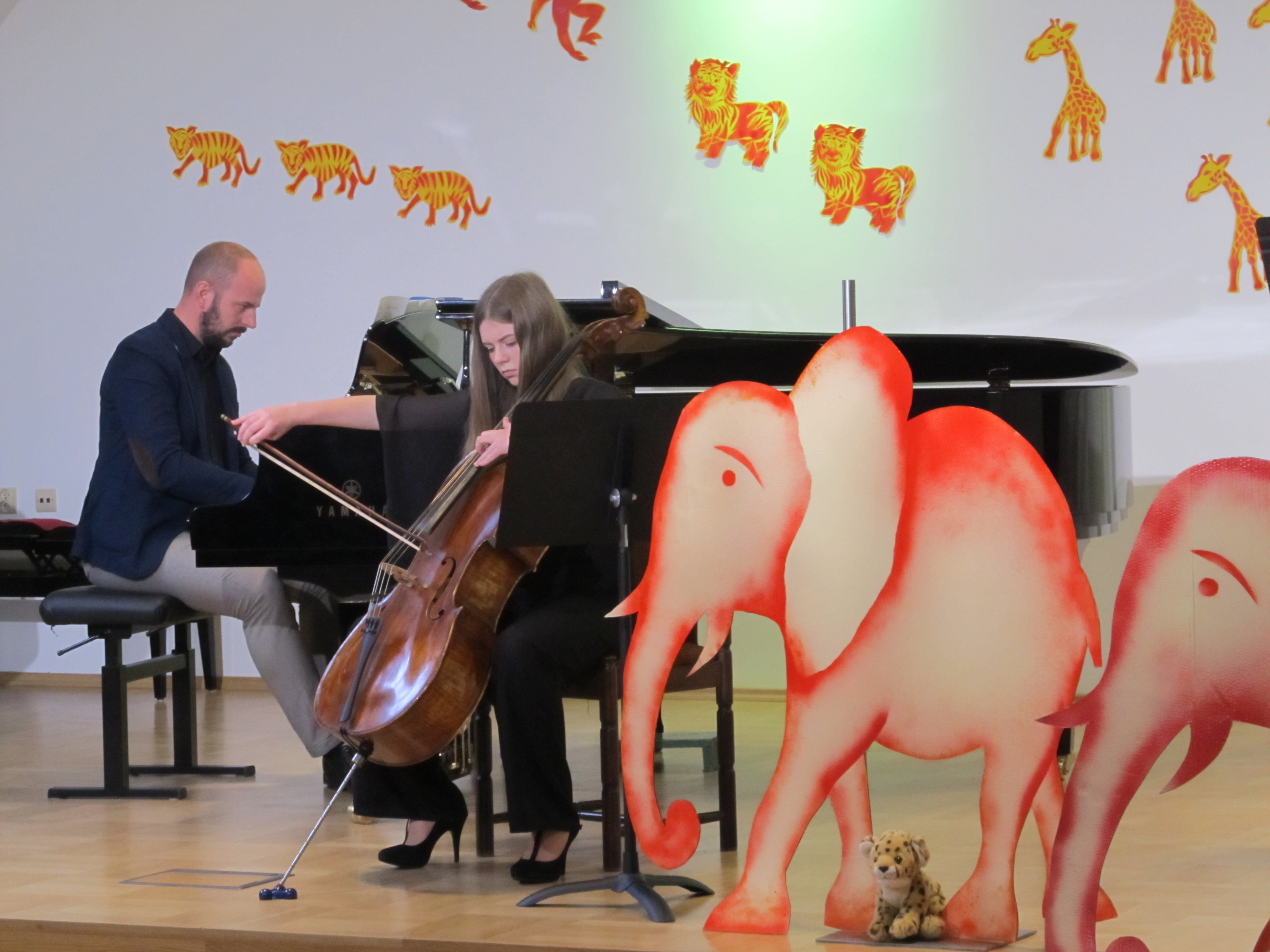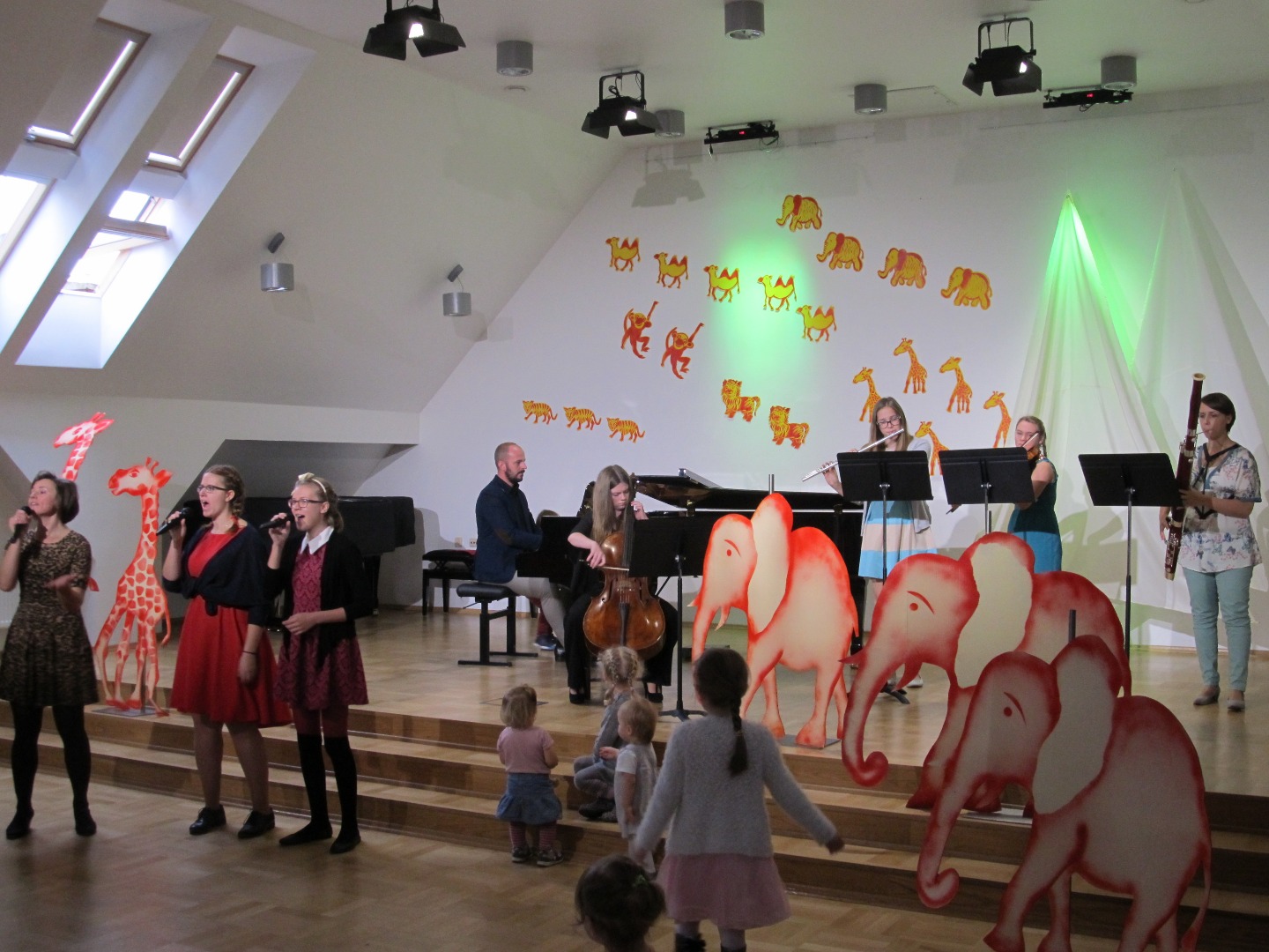 Tym razem południowe spotkanie z licznie zgromadzonymi w sali koncertowej najmłodszymi widzami i ich dorosłymi opiekunami zdominowały utwory muzyczne opowiadające o zwierzętach. W „Muzycznym zoo" znalazły się bowiem piosenki i melodie m.in. o łabędziu, psach, wielbłądzie, szczygle, słoniach i niedźwiedziu, wykonywane przez uczniów i nauczycieli PSM: wiolonczelistkę Alicję Polakowską, flecistkę Małgorzatę Nebratenko, fagocistkę Annę Słomiany, pianistę Krzysztofa Figla oraz solistki Marysię Kanarek, Gosię Biernacką i Adę Bąk. Koncert ze swadą i humorem tradycyjnie prowadziła zaś Agata Spodniewska-Kanarek.