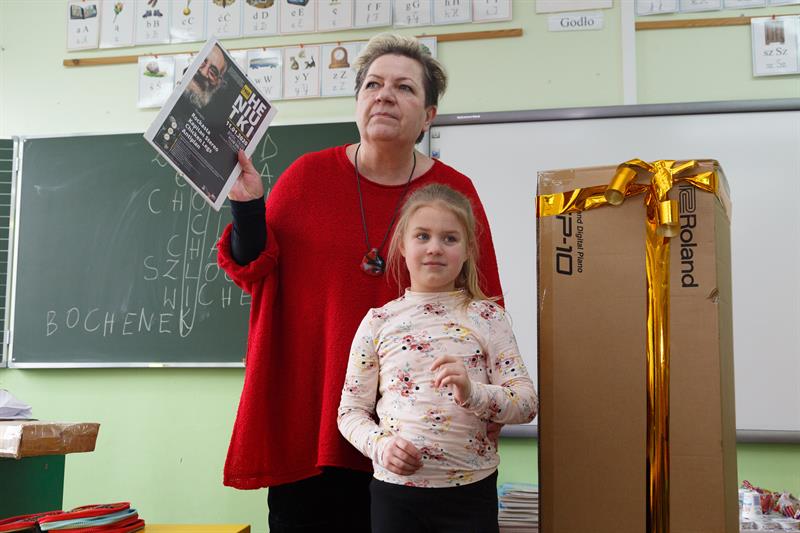 Na zdjęciu: Kornelia Suszczyńska była niezwykle zaskoczona, kiedy na lekcji w szkole otrzymała keyboard z rąk Ingi Kurek-Baranowskiej z Domu Kultury „Słowianin”.