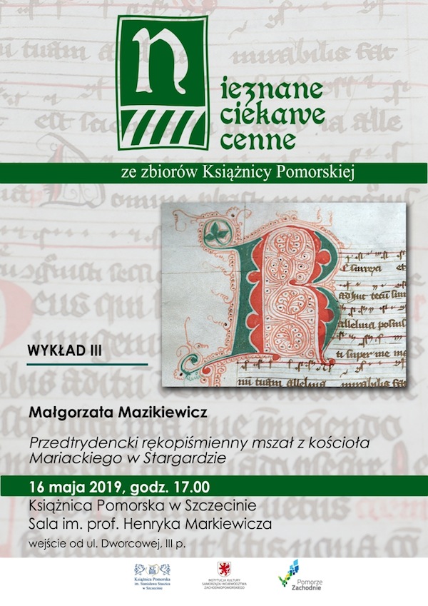 Małgorzaty Mazikiewicz, muzykolożka z Sekcji Muzycznej Działu Zbiorów Specjalnych, przedstawi pergaminowy mszał z XV wieku, pochodzący z biblioteki kościoła NMP Królowej Świata w Stargardzie. Jest to jeden z najstarszych zabytków liturgicznych i muzycznych dawnej diecezji kamieńskiej, spisany ręcznie na materiale piśmienniczym ze skór zwierzęcych. Podczas spotkania będzie można się dowiedzieć, czym charakteryzowała się liturgia przedtrydencka i co ją różniło od tej odprawianej współcześnie w katolicyzmie. Prezentacja mszału pomoże zrozumieć specyfikę tego cennego dzieła. Słuchacze dowiedzą się także, co łączy go z tradycją Kościoła katolickiego, a co z kultem religijnym średniowiecznej diecezji kamieńskiej, dla której został napisany.