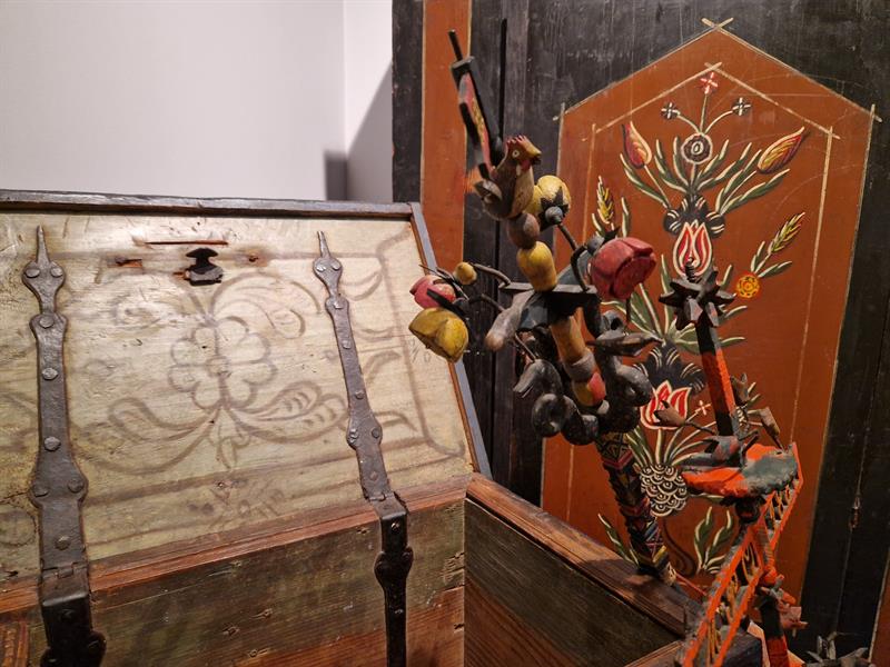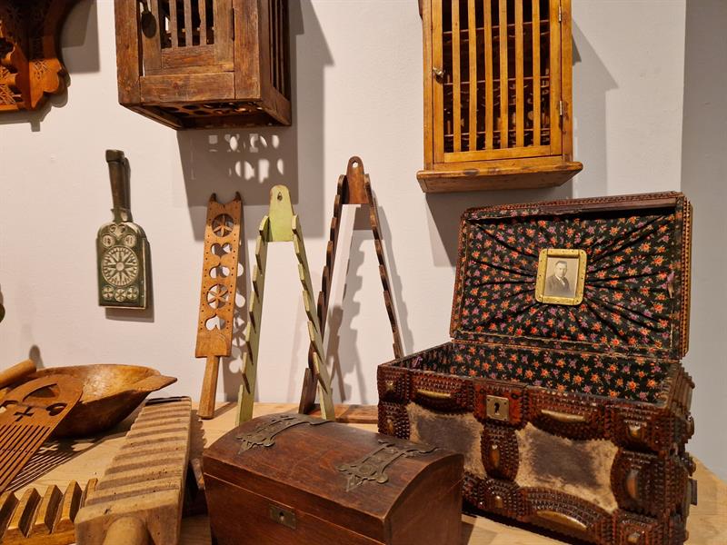 Wśród rzeczy wykonanych z drewna o bardziej artystycznym wymiarze znajdują się między innymi piękne skrzynie z kwiatowymi ornamentami, sekretarzyk, folklorystyczne figury, szafy i wiele innych eksponatów. Zarówno narzędzia, jak i dzieła sztuki ludowej pochodzą z różnych epok. Najstarszy zaprezentowany eksponat - kwatera ołtarzowa - pochodzi z XV wieku.