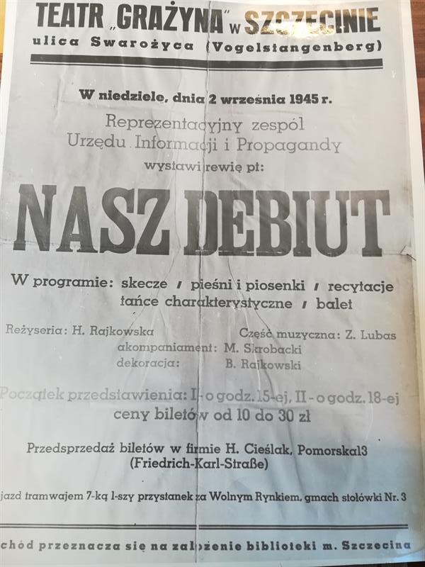 We wrześniu w szczecińskim Teatrze Polskim odbędą się wydarzenia pod wspólnym tytułem: „Stettin – Szczecin”. Inspiracją do nich było pierwsze widowisko teatralne w polskim Szczecinie, osiemdziesiąt lat temu. 2 września 1945 roku Teatr Grażyna wystawił, w sali przy ulicy Swarożyca 5, program artystyczny: „Nasz debiut”. Widowisko było składanką estradową pieśni i piosenek, recytacji, skeczy, układów tanecznych.