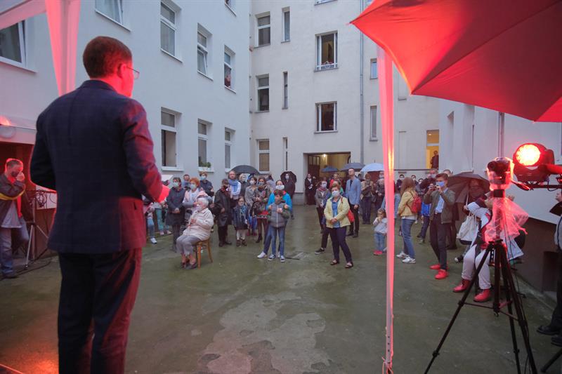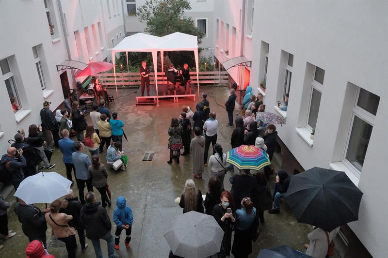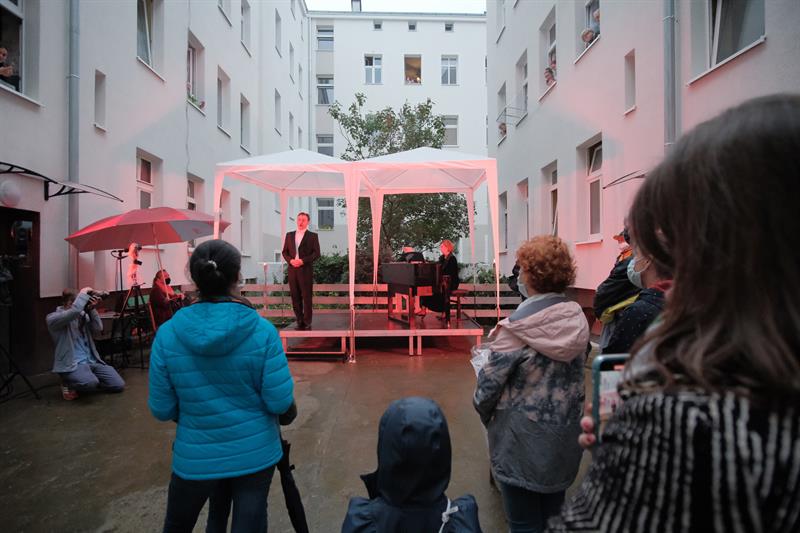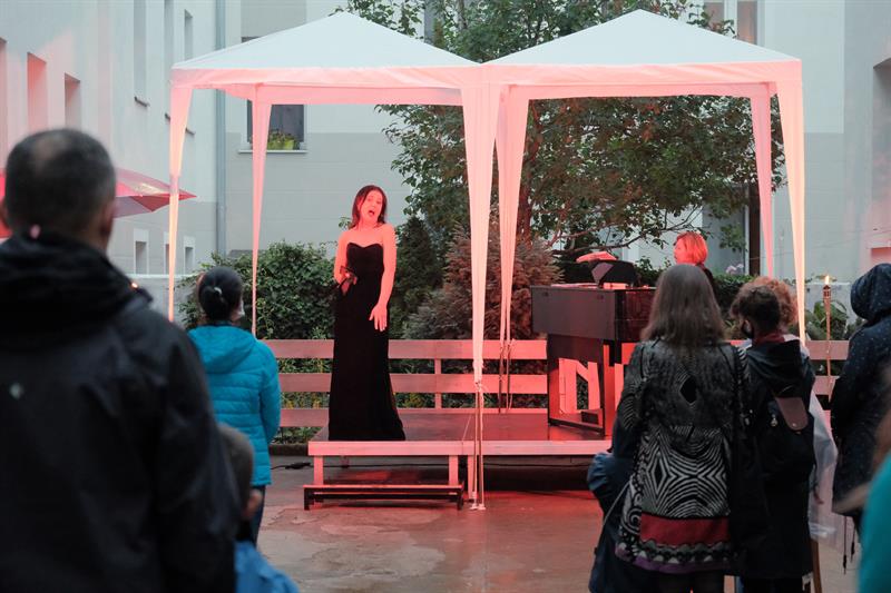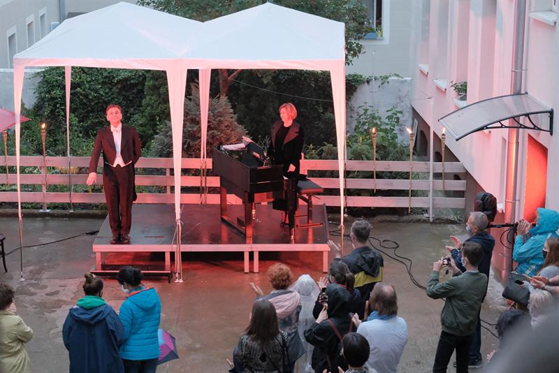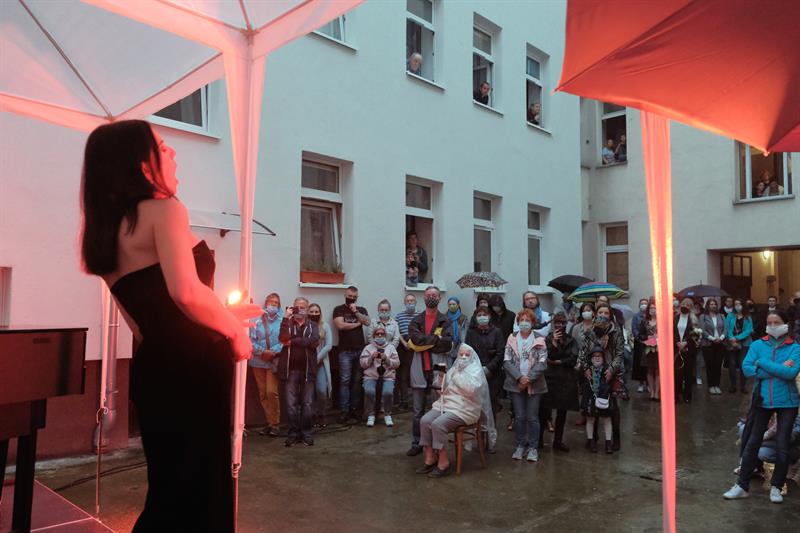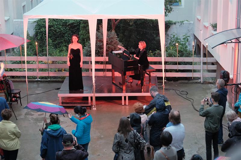 Kameralny koncert artystów szczecińskiej Opery na Zamku odbył się w sobotę na podwórzu kamienicy przy ul. Swarożyca 15 w Szczecinie. Wystąpili: Victoria Vatutina (sopranistka), Pavel Tolstoy (tenor) oraz Olga Bilas (akompaniatorka – fortepian). Deszczowa pogoda nie odstraszyła melomanów, część z nich wysłuchała występów pod parasolami albo w płaszczach przeciwdeszczowych. W lepszej sytuacji byli mieszkańcy wspomnianej kamienicy, bowiem mogli delektować się - pięknem głosów i muzyki - z własnych domów, z okien. Publiczność usłyszała zatem arie m.in. z oper: „Straszny dwór” S. Moniuszki, „Cyganeria” G. Pucciniego, „Rigoletto” G. Verdiego i „Porgy and Bess” G. Gershwina. Dla tych, którzy nie mogli przyjść na koncert, transmitowano go na Facebooku, na fanpage’u Opery na Zamku.
