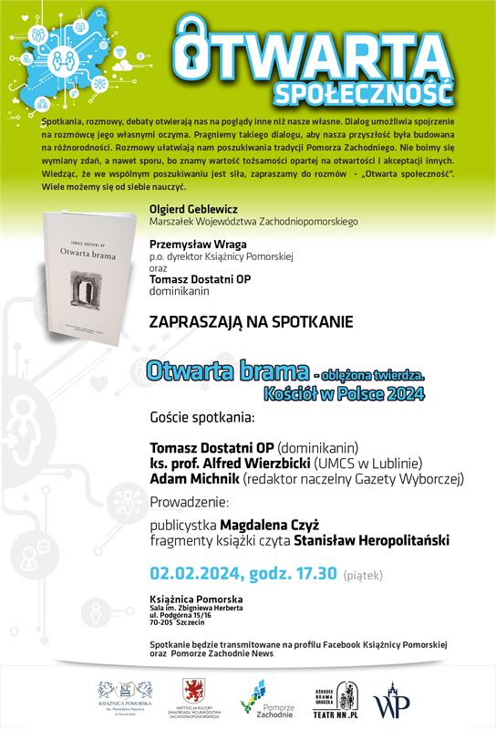 Pretekstem do kolejnego spotkania z cyklu „Otwarta Społeczność” jest książka o. Tomasza Dostatniego „Otwarta brama”. W debacie dotyczącej Kościoła w Polsce wezmą udział o. Tomasz Dostatni (dominikanin), ks. prof. Alfred Wierzbicki (UMCS w Lublinie) oraz Adam Michnik (redaktor naczelny Gazety Wyborczej).