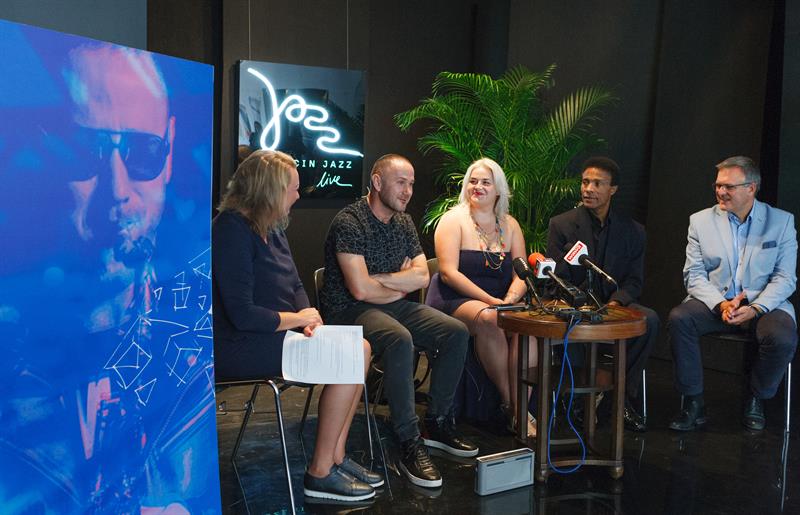 Na zdjęciu: Plany wydawnicze Szczecińskiej Agencji Artystycznej przedstawili na konferencji prasowej (od lewej): Anna Lemańczyk - dyrektor Szczecińskiej Agencji Artystycznej, Sylwester Ostrowski - muzyk i dyrektor artystyczny Szczecin Jazz, Jona Ardyn - wokalistka, Eric Allen - muzyk, Krzysztof Soska - zastępca prezydenta Szczecina.