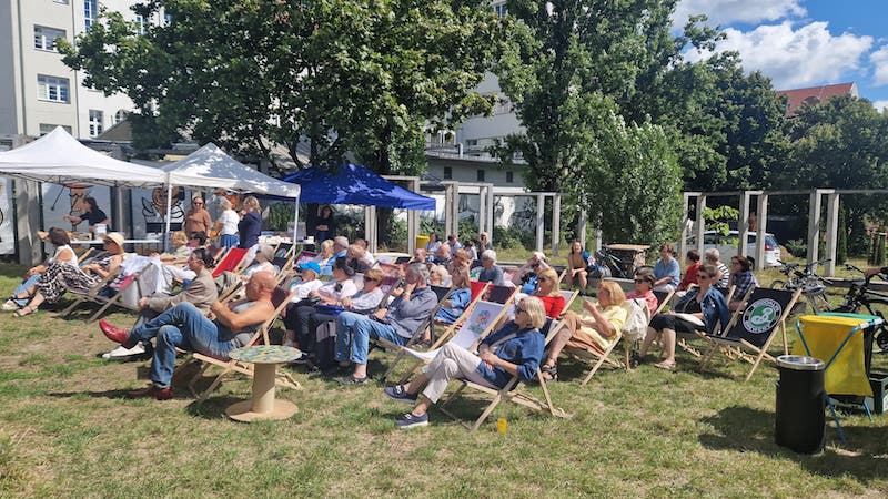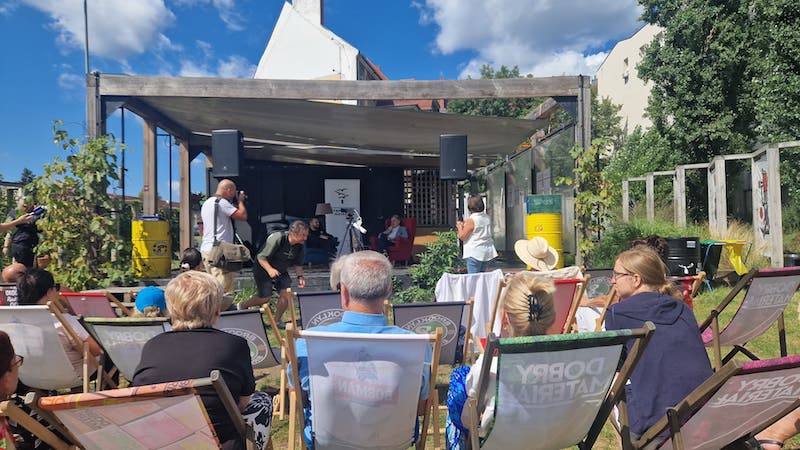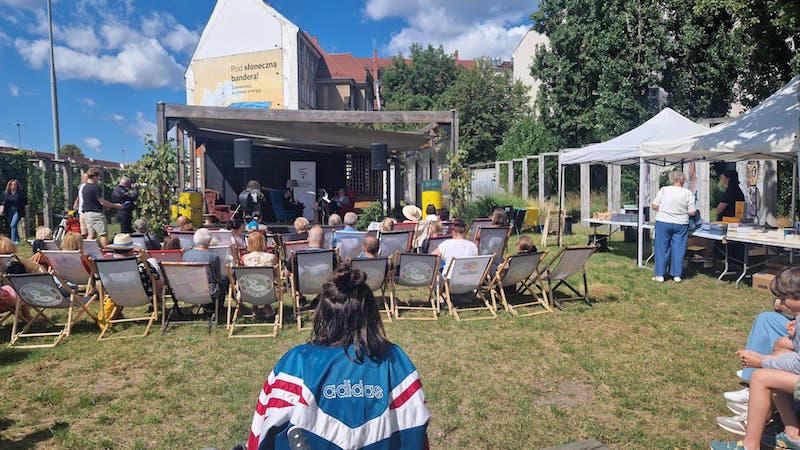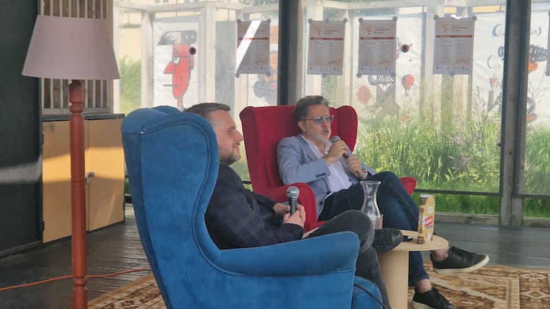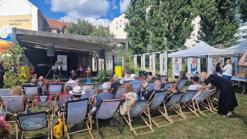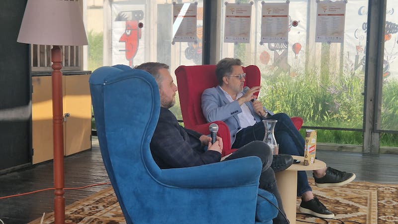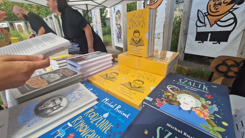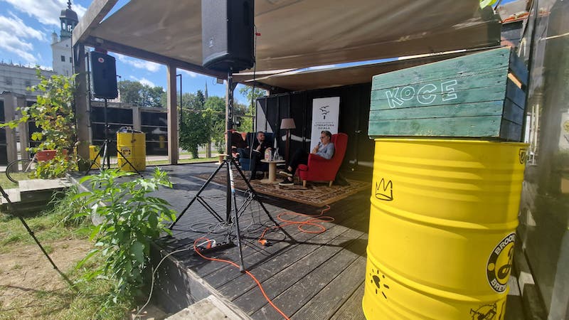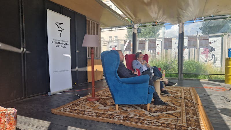 Spotkanie z Michałem Rusinkiem otwierało drugi dzień festiwalu, który odbywa się plenerowo - na Łące Kany. Formuła spotkania była dość kameralna, aczkolwiek frekwencja dopisała. Gość sobotniego spotkania rozpoczął od anegdot związanych ze wieczorami autorskimi, czym rozbawił publiczność.