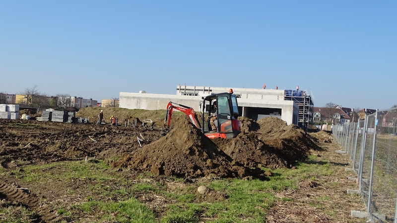 - Faktycznie, pogoda nam sprzyja, pozwoliła wyjść nam z pracami na zewnątrz - mówi Marcin Dziemidowicz, kierownik budowy. - Rozpoczęliśmy prace ziemne przed obiektem b1, gdzie będzie droga i parkingi oraz za budynkiem głównym, gdzie znajdzie się budynek b2, kryte korty tenisowe oraz boiska.