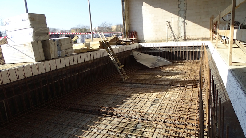 - Trwają prace na dachu budynku b1. W obiekcie głównym wykonywane są także ściany działowe, powstawiane zostały okna fasadowe, niektóre pomieszczenia są już potynkowane, trwają prace elektryczne oraz sanitarne. Wykonywana jest niecka basenowa oraz jacuzzi – wymienia kierownik.