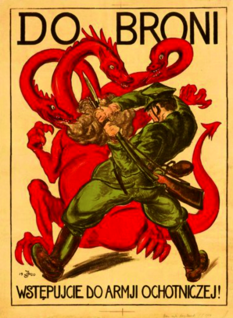 Wojna polsko-bolszewicka miała różne oblicza. Walki prowadzili i żołnierze, tocząc zażarte boje z czerwonoarmistami, i dyplomaci, zabiegając o pomoc państw europejskich. Walczyli też twórcy propagandy, dziś często już nieznani. Ich najważniejszym orężem były plakaty. Umieszczane w miejscach publicznych miały oddziaływać na postawy mas, ludzi słabo wykształconych, niekiedy analfabetów. Z tych powodów cechowała je prosta, wręcz prymitywna kompozycja. Odnosi się nieraz wrażenie, że zostały wykonane nieudolnie. Plakatom towarzyszyły krótkie hasła wyrażające treści i wartości prezentowane przez kompozycje plastyczne. Prosta forma, zrozumiała dla wszystkich, stanowiła ich siłę.