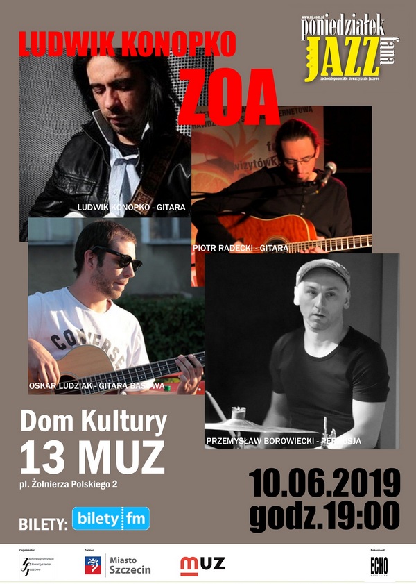 W szczecińskim Domu Kultury „13 Muz” odbędzie się dzisiaj o godz. 19 koncert zespołu Ludwik Konopko ZOA (w ramach cyklu koncertowego „Poniedziałek Jazz Fana” organizowanego przez Zachodniopomorskie Stowarzyszenie Jazzowe).